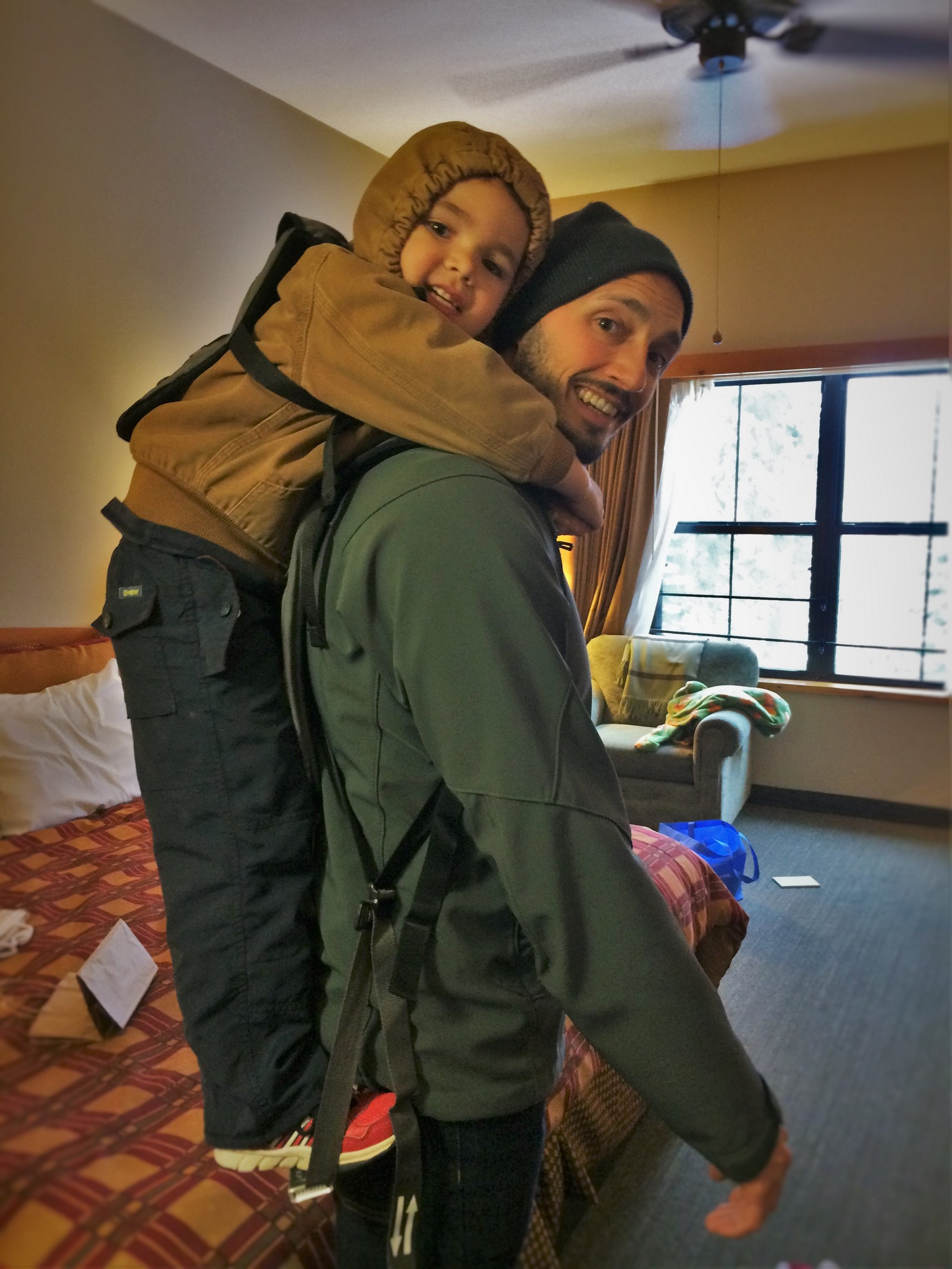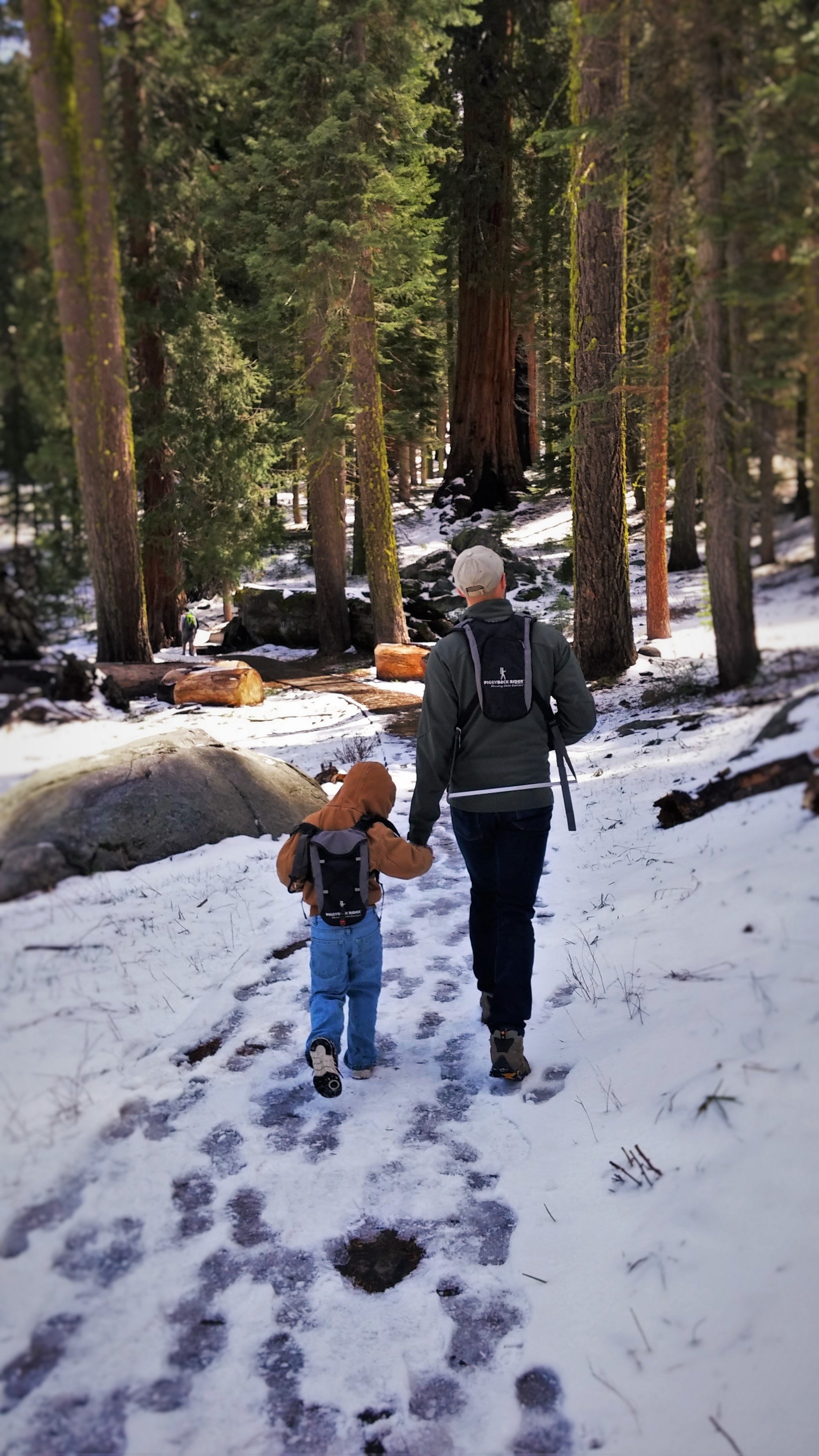 Funny story: when we were staying at the Wuksachi Lodge in Sequoia National Park we got snowed on hardcore. One night for dinner we needed to walk over to the Peaks Restaurant in the main lodge building to pick up our food… but we weren’t prepared for snow so didn’t have boots. We used the Piggyback Rider to transport Mr. Oliver to the lodge and keep him warm and dry. Perfect solution to the lack of snow attire.
